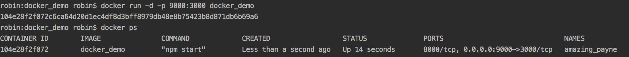 #启动镜像 -d表示后台执行,-p 9000:3000表示指定本地的9000端口隐射到容器内的3000端口,docker_demo为镜像名称