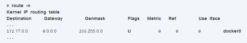 172.17.0.1/16。有了这样一块网卡,宿主机也会在内核路由表上添加一条到达相应网络的静态路由,可通过route