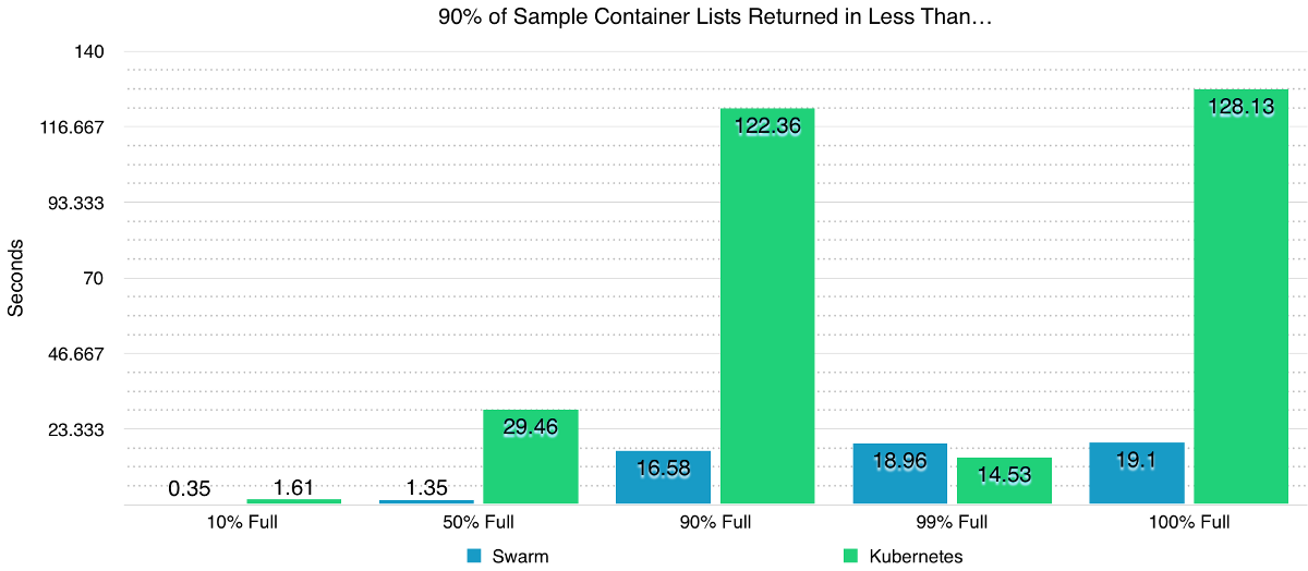 Swarm和Kubernetes在容器密度较低时都表现得很好。在10%集群资源使用率的情况下,Kubernetes罗列所有容器所花费的时间总是比创建一个容器耗费的时间短。