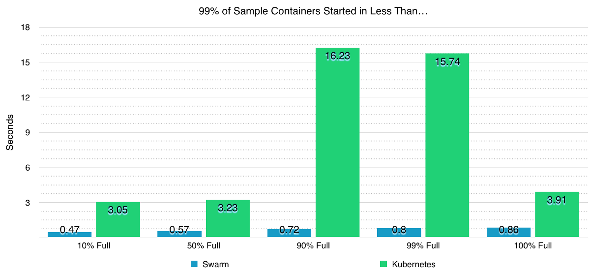 只要集群负载没有达到90%,Swarm有一半的概率可以在小于0.5秒的时间内启动一台容器。如果集群负载达到50%或更多,Kubernetes有一半的时间概率可以在大于2秒的时间启动一台容器。