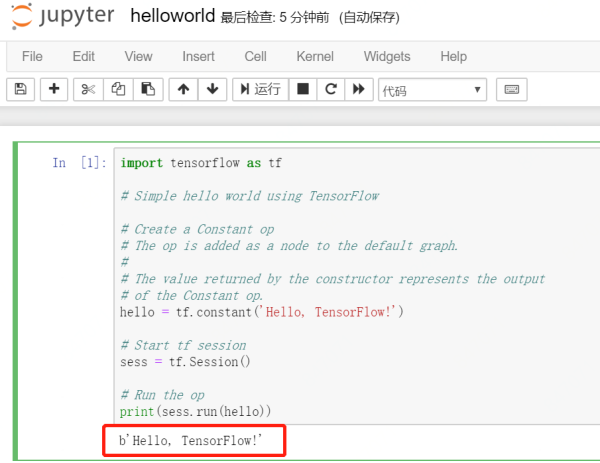 Jupyter中新建 HelloWorld 示例,代码如下: