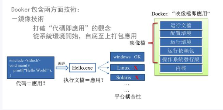 透过镜像(images)将作业系统核心除外,运作应用程式所需要的系统环境,