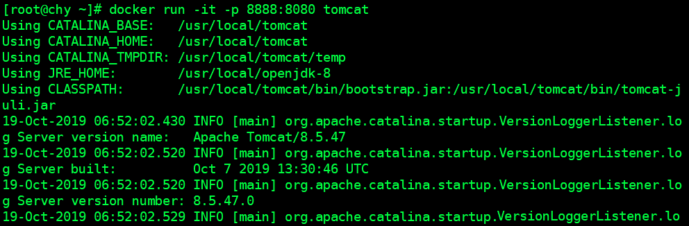 docker run -d -p 8080:8080 --name myt9 -v /myuse/mydocker/tomcat9/test:/usr/local/apache-tomcat-9.0.27/webapps/test