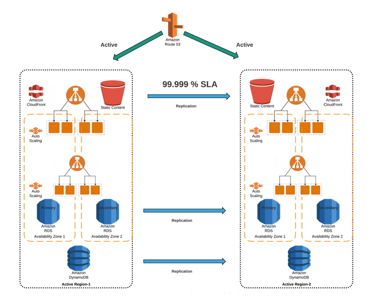 采用主动/主动的多区域方法。每个区域都必须是静态稳定的
