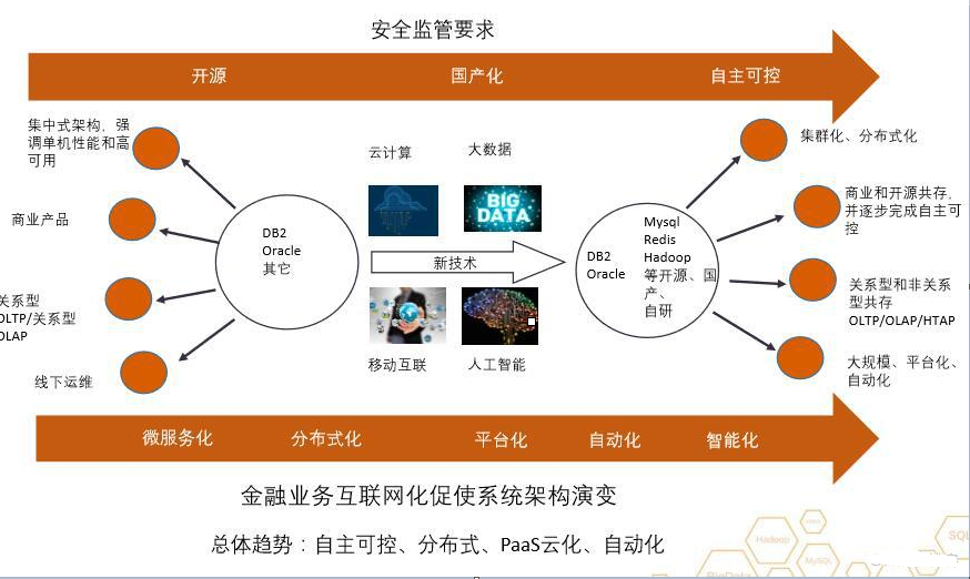从金融行业来讲我们大概有这么几个趋势,之前的话大家都知道在银行里面或者金融系统里面用的都是一些IOE,像一些产品的数据库加小机加存储,现在是因为我们的业务也是在不断地互联网化和移动化方向发展,同时现在因为对金融机构来讲监管有一些要求,比如说一些开源、国产化、自主可控这些方面对我们来讲就提出来一些新的要求。