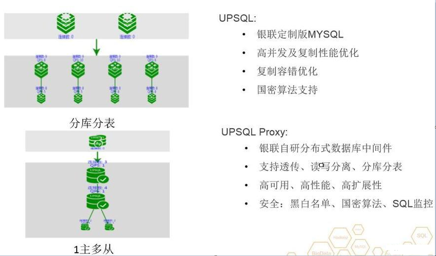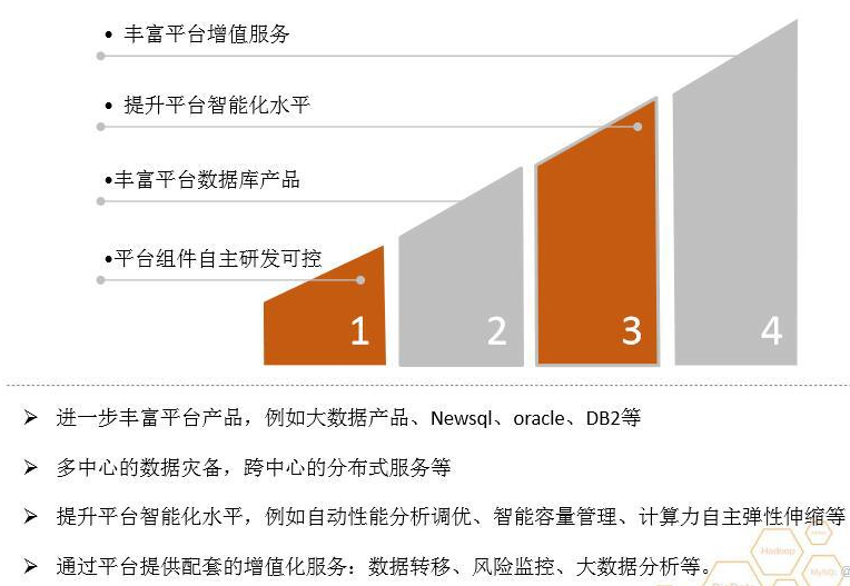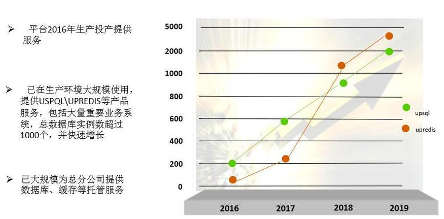UP和SCALE OUT。第三个就是我们高度服务化,我们把这个企业结构进行服务化的一些设计,我们很快速地把一些数据库产品进行包装。第四个的话就是我们当时是2015年就开始做数据库容器化,我们很早的时候,2015年的时候就把这个做出来了,而且大规模地在生态环境中用了,用在我们的金融领域,这应该在国内的金融领域算是比较早的。