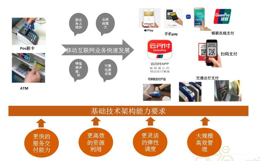 这个是针对我们银联自己来讲的话,就是我们银联在业务的转型对我们技术的需求。之前的话大家可能也都知道基本上银联的业务场景就是POS刷卡、ATM取钱、操作,但是这几年的话业务发展慢慢的也是移动互联网化,比如说像我们的一些产品,包括云闪付APP,大家用的是apple