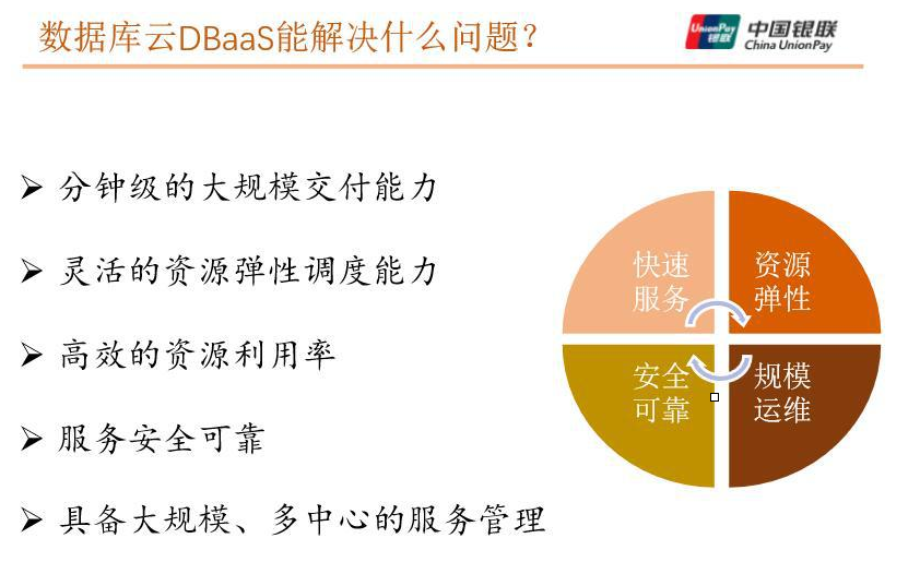 刚才前面讲到的就是知识架构那一块需要那些能力的话,那我们通过什么方法来解决呢?比如说我怎么快速去交付,我怎么样去弹性提供资源,然后我在想可能大家想的都一样,通过云的方法去做,那么做数据库云去解决这些问题。那作为一个数据库云架构,应该有灵活的资源弹性调动能力,高效的资源利用率,服务安全可靠,具备大规模的服务管理。