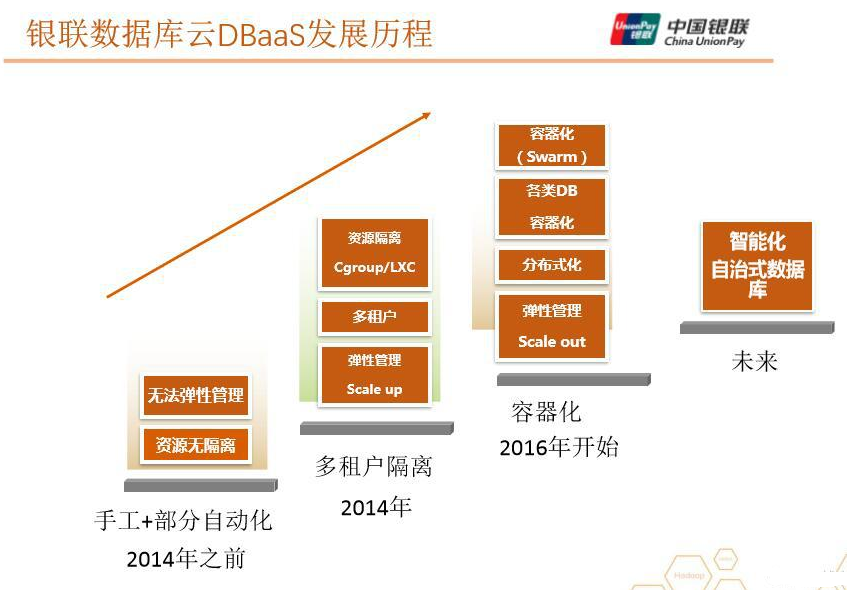 我们银联这一块就是在金融行业里面做开源这一块的话相对来讲应该是比较早的,我们在2012年的时候就开始做,那个时候的话因为数量比较少,早期的话我们主要是用手工加一些自动化脚本制作的一些运维,但是到2014年的时候,我们生产的Mysql数据库越来越多了,那时候我们就想着做平台来管理那时候是DBaaS1.0。