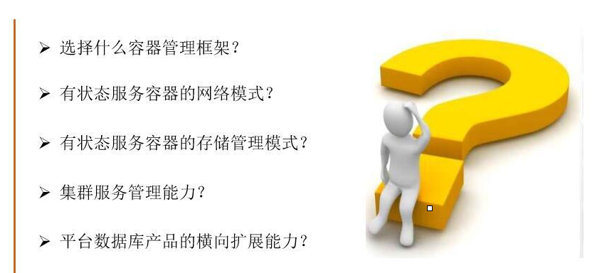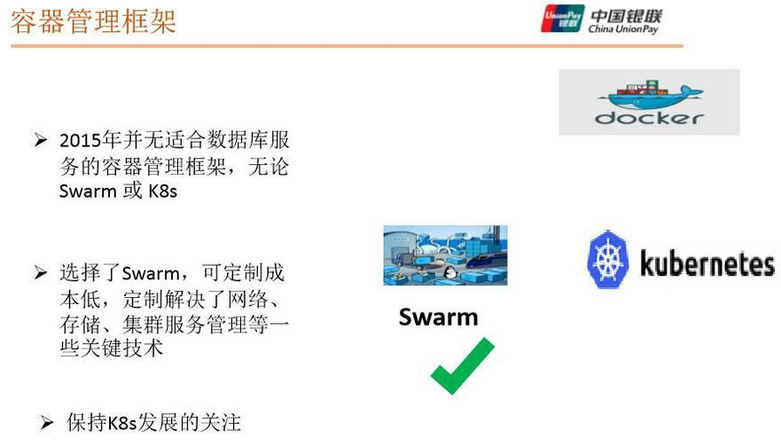 讲一下我们当时做那个容器的框架选择的时候为什么我们选的是Swarm。因为当时其实也是面临两个选择,一个是用Swarm另一个是用K8s,但是同样2015年那个时候来看的话,我们是研究了一下发现就是说做数据库的话,这两个都不能很好地解决我们的问题,就是说它的原生的一些网络架构或者一些管理架构都没法满足我们的一些需求,所以这两个都是要我们定制和开发的,要在我们自己去设想开发,所以我们当时就选了Swarm。