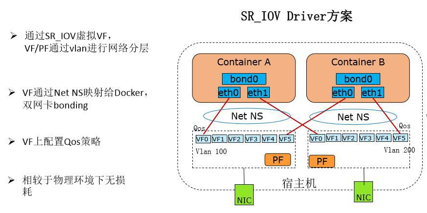 NS映射给Docker, 双网卡bonding。VF上还可以直接配置Qos策略,相较于物理环境下无损耗,这一点是非常非常可贵的,就是在我们做数据库容器化的时候一个很关键的点,这个方案我后来也看到了,就是蚂蚁金服他们自己以前做的也是这种方案。