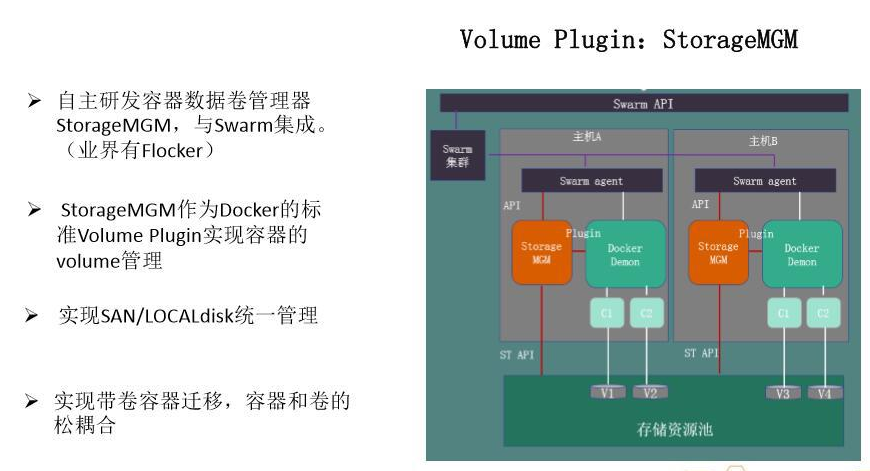 为什么选这个呢?首先是因为它是一个轻量级的,然后可定制性比较高,就是开发相对难度要小一点,所以我们选择了Swarm,当时来讲Swarm其实发展势头还是蛮好的,特别是这两年发展的比较好,但是就是到今天为止K8s也没有办法完完全全满足数据库容器化的这个需求,它也没有用原生态去做一个复杂的数据库平台网络和存储模型,我们也一直在关注这个的发展。