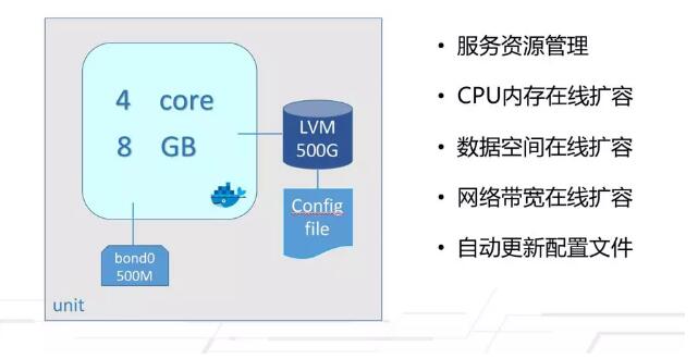 unit我们定义是一个服务中的最小管理对象,它是由一个容器(包含Namespace,二进制版本,环境变量),多个逻辑卷对象和目录对象,一个网卡设备和IP,和配置文件对象。