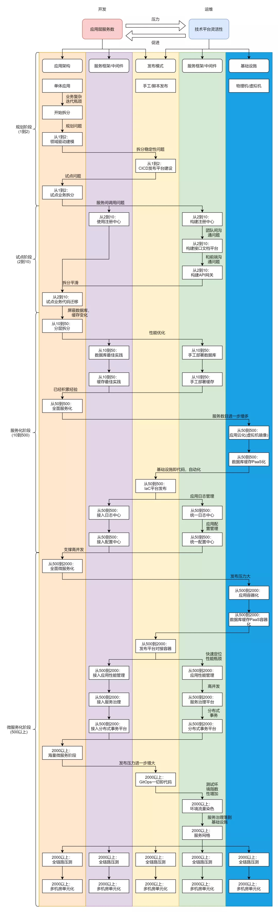 很多企业应用层服务化或者微服务化,而技术底座没有跟上,从而系统陷入混乱,没日没夜加班,却怪服务化不好,另外一些企业花了大价钱卖了一个技术底座平台,但是应用层没有跟上,无法促进业务发展,嫌技术底座白花了钱,这两个误区都在于没有沿着这个怪圈逐渐演进。