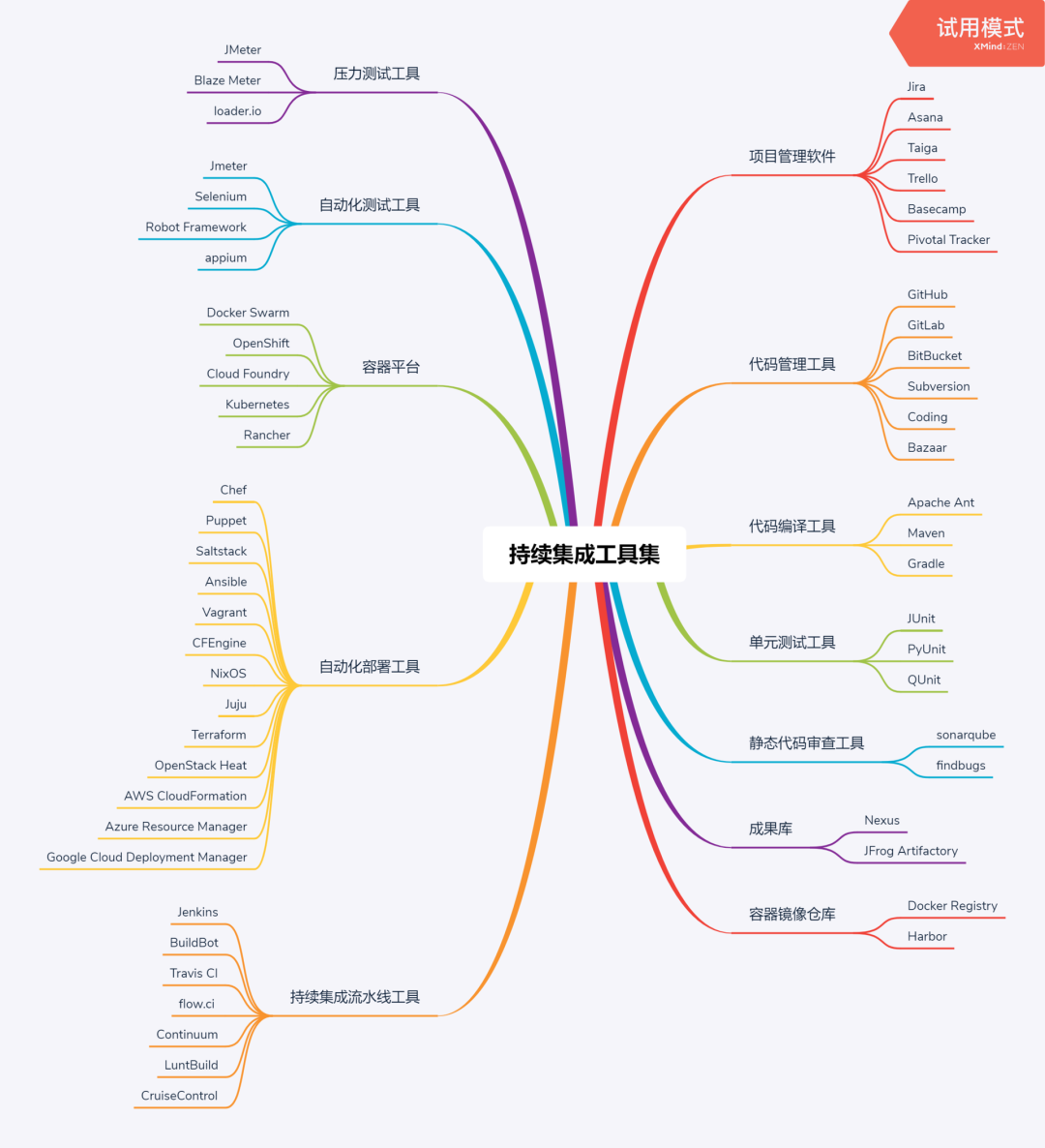 上面的这幅图呢,是一个持续集成的总体流程图,里面包含非常多的工具,这些工具呢,有非常多的选型。下面的这个脑图,就总结了持续集成中所常用到的主流工具。你可以根据自己公司的情况。来选择合适的工具。