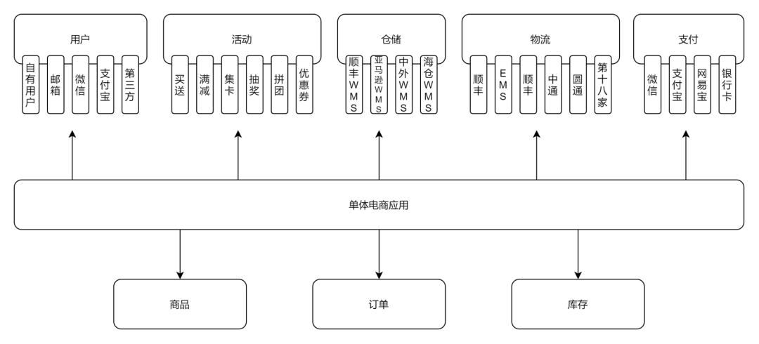 这么说有点虚,我们举个现实的例子。例如按照领域的划分,对于电商业务来讲,一个单体的电商服务,应该拆分成下面这些服务。