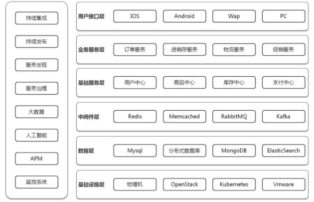 第四个层次是基础服务层,有的时候成为中台层,将通用的能力抽象为服务对外提供原子化接口。这样上层可以根据业务需求,通过灵活的组合这些原子化接口,灵活的应对业务需求的变化,实现能力的复用,以及数据的统一管理,例如用户数据,支付数据,不会分散到各个应用中。另外基础服务层称为应用和数据库和缓存的一个分界线,不应该所有的应用都直接连数据库,一旦出现分库分表,数据库迁移,缓存选型改变等,影响面会非常大,几乎无法执行。如果将这些底层的变更拦截在基础服务层,上层仅仅使用基础服务层的接口,这样底层的变化会对上层透明,可以逐步演进。