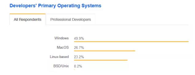 Stack Overflow Developer Survey 2018有这样一个统计,对于开发人员来说,桌面操作系统的排名是Windows,MacOS,Linux,所以大部分人平时的办公系统都是windows。