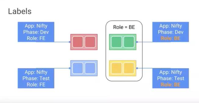 因为标签可以是任意的键值对,其表达力非常强。参考下图,以有名字为'Nifty‘的应用部署到四个容器里面。通过选择BE标签你可以挑选出后端容器。