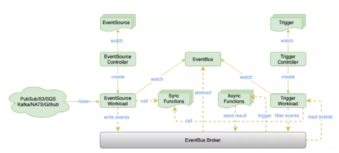 EventSource:用于对接众多外部事件源如 Kafka、NATS、 PubSub、S3、GitHub
