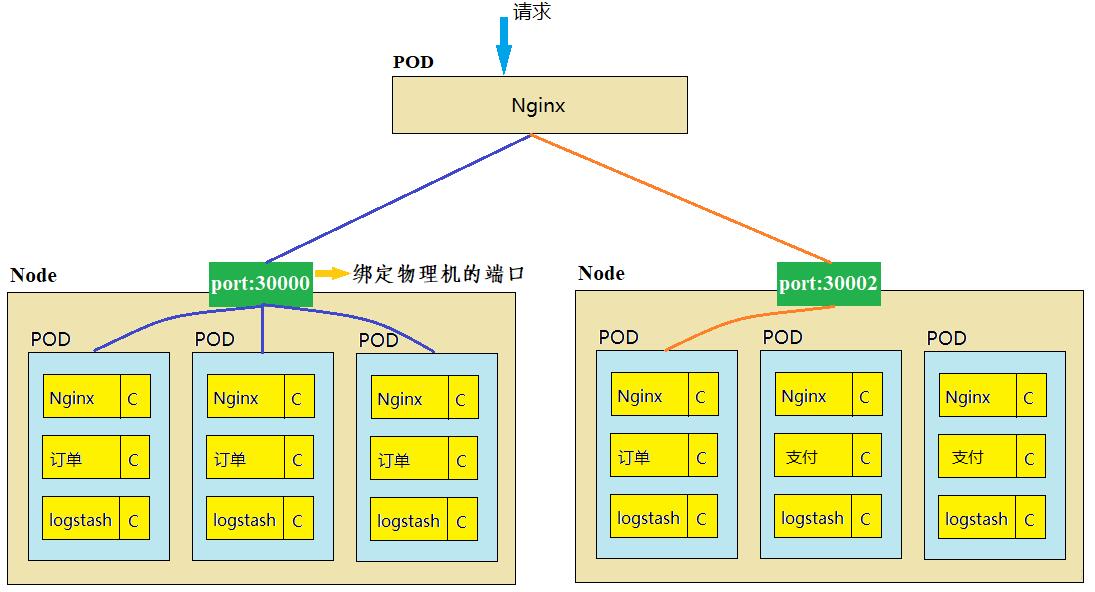 举例:如下图,注意下图右边的 Node 里面有两个是 支付 服务,与订单服务的是不同类型的 pod。如果一个请求订单的服务发来上面那个