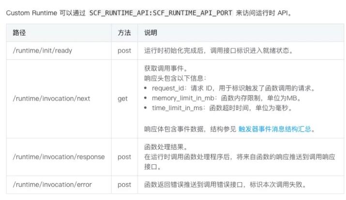 Custom Runtime(以下简称 CR)使用方法较为简单:CR 会暴露一套 HTTP API 提供给用户环境,而用户只需要到特定端口上发送/接收 HTTP 请求,即可以获得 SCF 下发的各种 event,并返回处理结果。具体的文档可以参考 :Custom Runtime 说明 [1] 。