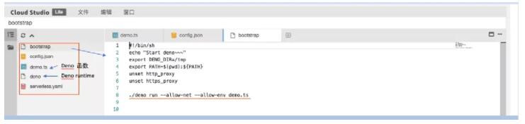 这里我们用 SCF 中 CustomRuntime 的 Deno 模板示例做说明,如下图所示,程序包里有: