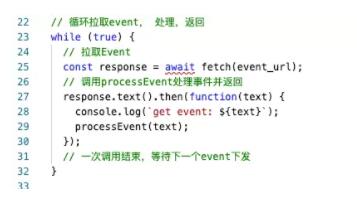 可以看到,是通过 GET (fetch) 循环拉取 event, 然后调用 processEvent() 来进行处理。processEvent() 逻辑如下所示: