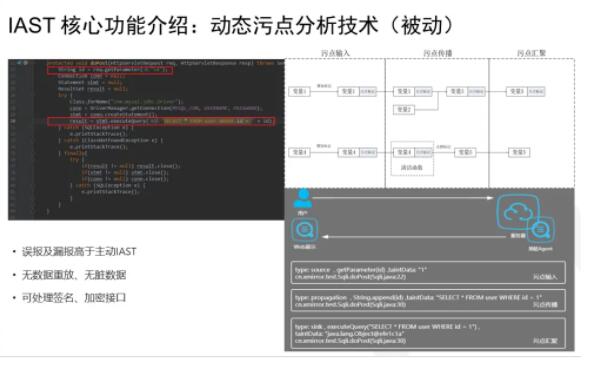 IAST的另一个核心功能:被动模式,它主要引入了动态污点分析技术。动态污点分析分为三个阶段:污点输入、污点传输、污点汇聚。当一个请求流量输入后,会给变量打上污点标记,当变量携带着污点标记在整个函数内部流转时,就可以观察它经历了哪些函数,整个过程就是一个污点传播过程。