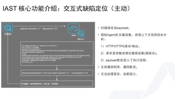 IAST的核心功能之一:主动模式。主动模式又称为“交互式缺陷定位”,那么其中的“交互”对象是什么?以图示(上图左侧)为例,可以看到“扫描控制端”,在这个流程当中,当有了点击、访问之后,Web端能接收到请求流量,此时IAST工具与中间件集成,接收到相应流量,在对这些流量进行初步筛查后,将筛选流量发送到扫描控制端,扫描控制端会结合Payload进行数据流量重放。重放验证的过程中能根据请求和响应,以及函数代码执行流,判断其中是否存在安全漏洞。