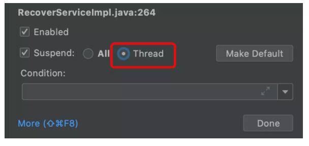 Suspend All,改为 Suspend Thread 即可。不过这个也不是最优解,因为这个需要用户手工配置阻断级别,有认知学习成本。