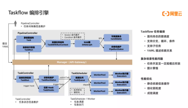 前面讲的风险阻断、变更灰度和黑屏变更收敛,都是在解决ASI稳定性问题。但是,谁又能帮助解决我们SRE同学面临的挑战呢? 做稳定性的同学都知道:只有将变更白屏化/在线化之后,我们才能对这些变更中心化管控,把控变更风险。但是对于ASI这种非常庞大复杂的基础设施服务来说,变更场景繁多、复杂。我们SRE负责整个ASIOps运维管控平台的建设,既要面对每天繁重的运维工作,还要建系统,更要命的是我们的同学都是后端开发工程师出身,Ops系统需要做前端界面,写前端是后端工程师的梦魇,经常是一个后端功能1h写完,前端页面要画至少一天。 SRE团队是一个技术服务团队,不仅仅要让我们的服务方满意,更要让我们自己满意。所以,我们在搞系统能力建设的过程中,一直在探索怎么降低运维系统开发的成本。大家应该也知道,运维能力和业务系统能力不同,运维操作更多是多个操作编排起来的一个综合操作,比如解决线上ECS上ENI网卡清理的问题,完整的运维能力是:首先在节点上执行一个扫描脚本,将泄漏的ENI网卡扫描出来;然后是将扫描出来的泄漏的ENI网卡作为入参传给清理ENI网卡的程序;最后ENI网卡清理完成,上报相应的状态。所以,我们当时就想做一个事情:实现一套运维操作编排引擎,能快速的将多个单个独立的运维操作编排起来实现复杂的运维逻辑。当时我们也调研了很多编排工具比如tekton、argo这类的开源项目。发现要么是项目PR的非常好,但是功能还是太基本,没办法满足我们的场景;要么就是在设计上更多的是适用于业务场景,对于我们这种底层基础设施非常不友好。 所以,我们决定取现在已有编排工具的精华,参考他们的设计,实现ASI自己的一套运维编排引擎工具。这就是ASIOps中Taskflow编排引擎的由来,架构设计如下图所示: