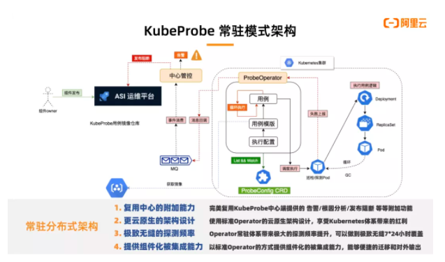 对于某些需要7*24小时不间断的高频短周期探测用例,我们还实现了另外一套常驻分布式架构,这套架构使用一个集群内的ProbeOperator监听probe config cr变化,在探测pod中周而复始的执行探测逻辑。这套架构,完美复用了KubeProbe中心端提供的告警/根因分析/发布阻断等等附加功能,同时使用了标准Operator的云原生架构设计,常驻体系带来了极大的探测频率提升(因为去掉了创建巡检pod和清理数据的开销)基本可以做到对集群的7*24小时无缝覆盖,同时便于对外集成。 另外还有一个必须要提的非常重要的点,那就是平台只是提供了一个平台层的能力支持,真正这个东西要起作用,还是要看在这个平台上构建的用例是否丰富,能不能方便的让更多人进来写各种巡检和探测用例。就像测试平台很重要,但测试用例更重要这个道理一样。一些通用的workload探测,组件探测,固然能发现很多管控链路上的问题,但是更多的问题,甚至业务层的问题暴露,依赖于基础设施和业务层同学的共同努力。从我们的实践上来说,测试同学和业务同学贡献了很多相关的检查用例,比如ACK&ASK的创建删除全链路探测巡检,金丝雀业务全链路扩容用例,比如本地生活同学的PaaS平台应用检查等等,也得到了很多稳定性上的结果和收益。目前巡检/探测用例有数十个,明年有机会破百,巡检/探测次数近3000万次,明年可能会过亿。可以提前发现99%以上的集群管控问题和隐患,效果非常好的。