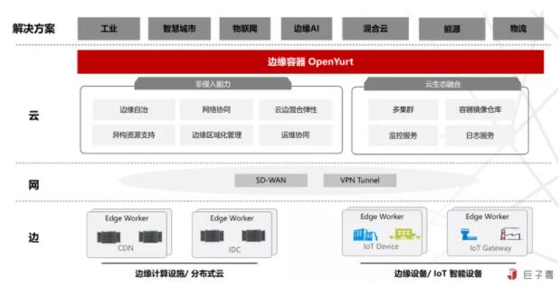 OpenYurt 以上游开源项目 Kubernetes 为基础,针对边缘场景适配的发行版。是业界首个依托云原生技术体系、“零”侵入实现的智能边缘计算平台。具备全方位的“云、边、端一体化”能力,能够快速实现海量边缘计算业务和异构算力的高效交付、运维及管理。