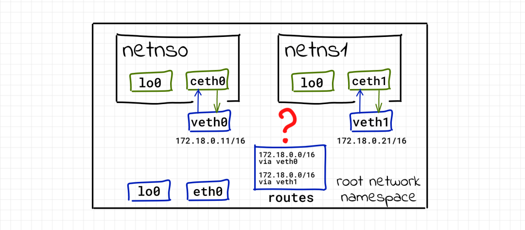 创建的veth0和ceth0都在主机的网络栈(也称为root网络命名空间)上。将netns0命名空间连接到root命名空间,需要将一个设备留在root命名空间,另一个挪到netns0里: