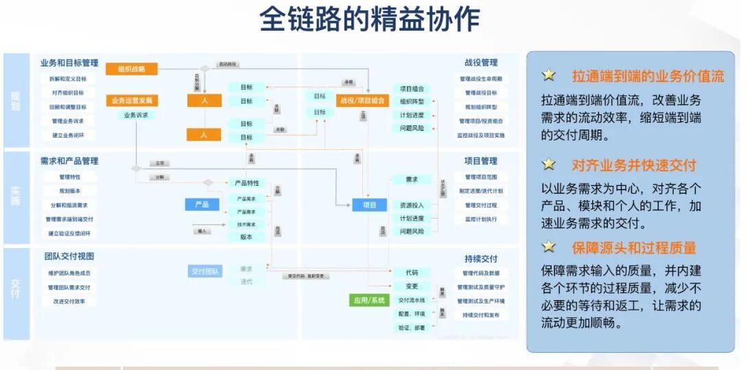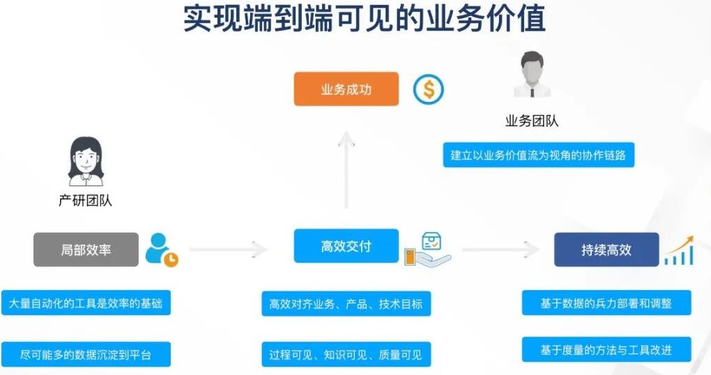所以笔者认为效能提升首先要做到的就是端到端可见的业务价值。从业务团队到产研团队有以下几个实施路径。首先是建立以业务价值流为视角的协作链路。以往多半是通过项目管理软件解决产研团队的协作问题,以一个产品或者团队为单位组织需求、缺陷、任务等等。在新的体系中需要将业务团队也纳入其中,并且拉通业务价值与产品研发需求、任务之间的关系,从而实现端到端透明可视。