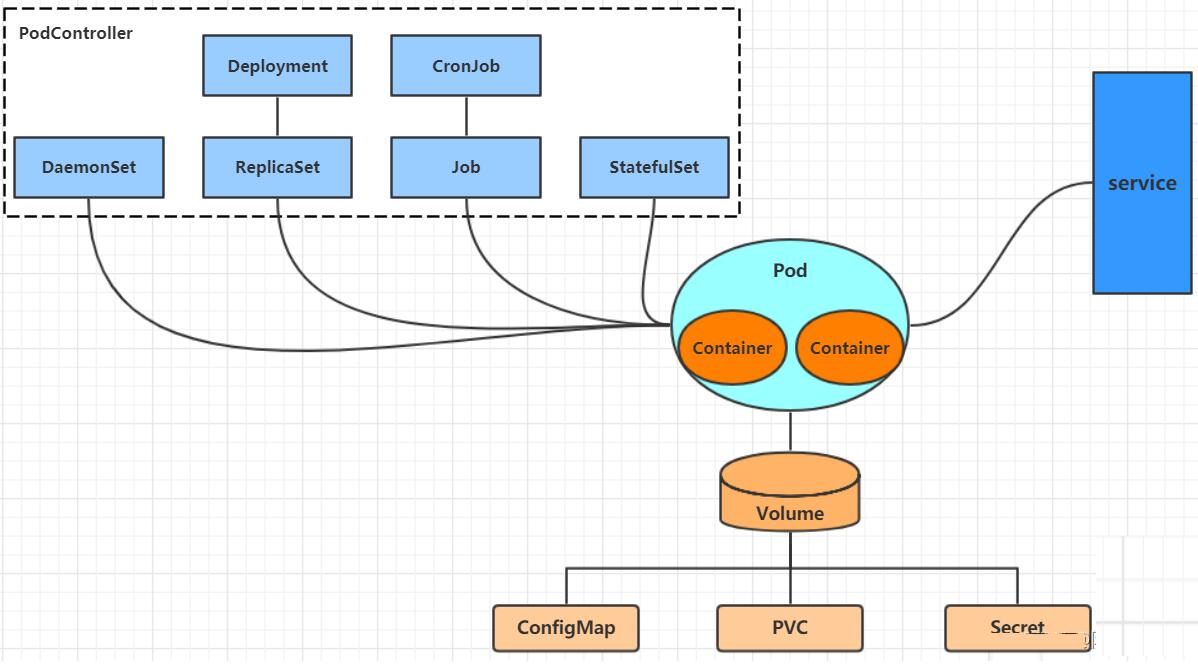 Controller:控制器,通过它来实现对pod的管理,比如启动pod、停止pod、伸缩pod的数量等等