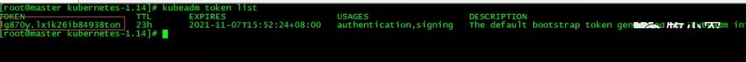 如果我们忘记了这条命令,我们可以通过 kubeadm token list命令去查看,然后将下方的IP地址和token替换一下就可以了,其他不用替换
