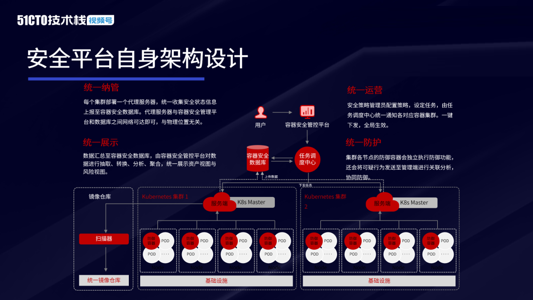 最后比较关键的一点,在云原生领域中,云原生安全自身软件的平台须要符合三层架构:第一层是管理层,管理平台必须与任务中心解耦,这样所有的集群才可以汇聚。