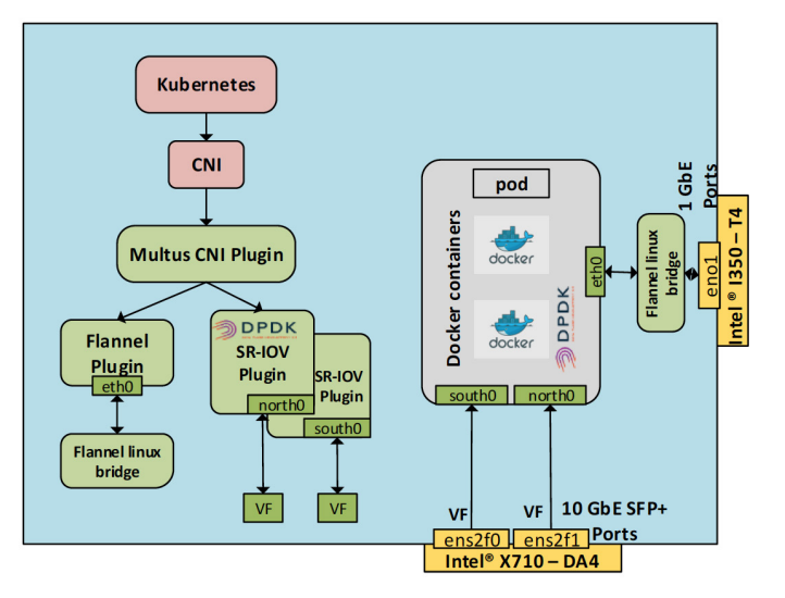® X710-DA4 上另外一个端口。Pod 内的 VF 接口名称为 north0。该接口绑定到 DPDK