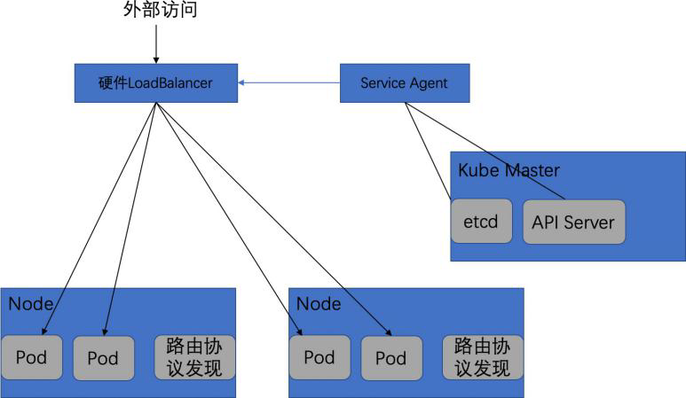 同时,每台Node上都运行着有路由发现协议的软件,该软件负责将这个Node上所有的地址通过路由发现协议组播给网络内的其他主机,当然也包含硬件负载均衡器。这样硬件负载均衡器就能知道每个Pod实例的IP地址是在哪台Node上了。通过上述两个步骤,就建立起一个基于硬件的外部可感知Service的负载均衡器。