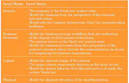 这些层次的数量和范围是定义完善的:我们有四个不同的层次:公司黑盒子、系统黑盒子、系统内的逻辑设计以及物理实现。