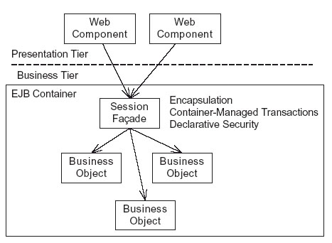 经典的J2EE解决方案是:用EJB来封装业务逻辑-基本的session facade.EJB容器提供事务处理管理,安全,分布式事务处理和远程访问。Facade方式可以通过封装业务逻辑来提高程序可维护性。粗糙型(Coarse-grained)