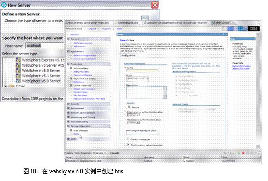 RSA内嵌了WebSphere Application Server 6.0的运行环境,WAS 6.0中的SI-BUS实现了ESB,因此我们可以用RSA进行SOA、ESB的部署和测试。如图10所示,可以在RSA上创建WAS