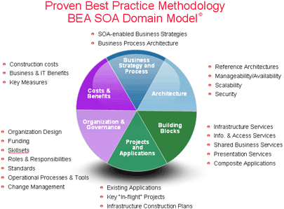 为了保证成功,SOA以一种新的方式要求IT和业务协同工作。开始SOA规划时,需要在技术性和非技术性要素之间进行有效的平衡。为此BEA开发了一个域模型(如图2所示),帮助指导您规划必须同等重视的六个关键方面,以确保成功实施。