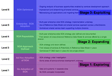 BEA的SOA成熟度矩阵(如图3所示)帮助监视SOA效果,这样您可以检查不同开发阶段的进度。这个矩阵被划分成三个阶段:探索(Exploring)、扩展(Expanding)和开拓(Exploiting)。可以使用像BEA