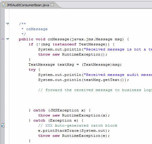 在下面的步骤中,我们将更新 CreditHistory 模块,以便将审核消息写入 JMS 队列。消息的使用者在