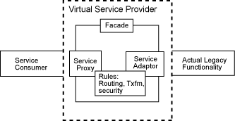 解决方案:通过指定您所需要的服务并假定该服务已被提供的方式来创建虚拟提供者。使用代理与遗留系统通信,同时使用适配器将所使用的协议转换为在服务描述/协定中指定的您所希望/需要/拥有的协议,自己创建服务提供者。将代理和适配器封装在虚包