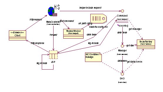 执行过程如上图,首先请求发送给主控制器,主控制器委托辅助类(Request Helper)根据分析url然后在配置文件中找到实际的command并执行,command获取请求的参数并委托Services层的各相应Manager类来处理相应的业务逻辑,其中如果有数据库操作的话则委托DAO来完成,将结果返回到command,command将结果(Data