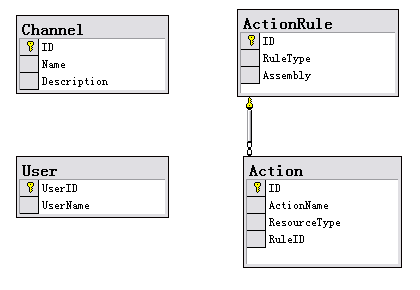 对于这样的需求我们就需要对每一种不同的资源创建一张权限表,在上图中对Content和Channel两种资源分别创建了UserActionContent和UserActionChannel表用来定义用户对某条记录是否有权限;这种设计是可以满足用户需求的但是不是很经济,UserActionChannel和UserActionContent中的记录会很多,而在实际的应用中并非需要记录所有的记录的权限信息,有时候可能只是一种规则,比如说对于根Channel什么级别的人有权限;这时候呢我们就可以定义些规则来判断用户权限,下面就是这种设计。